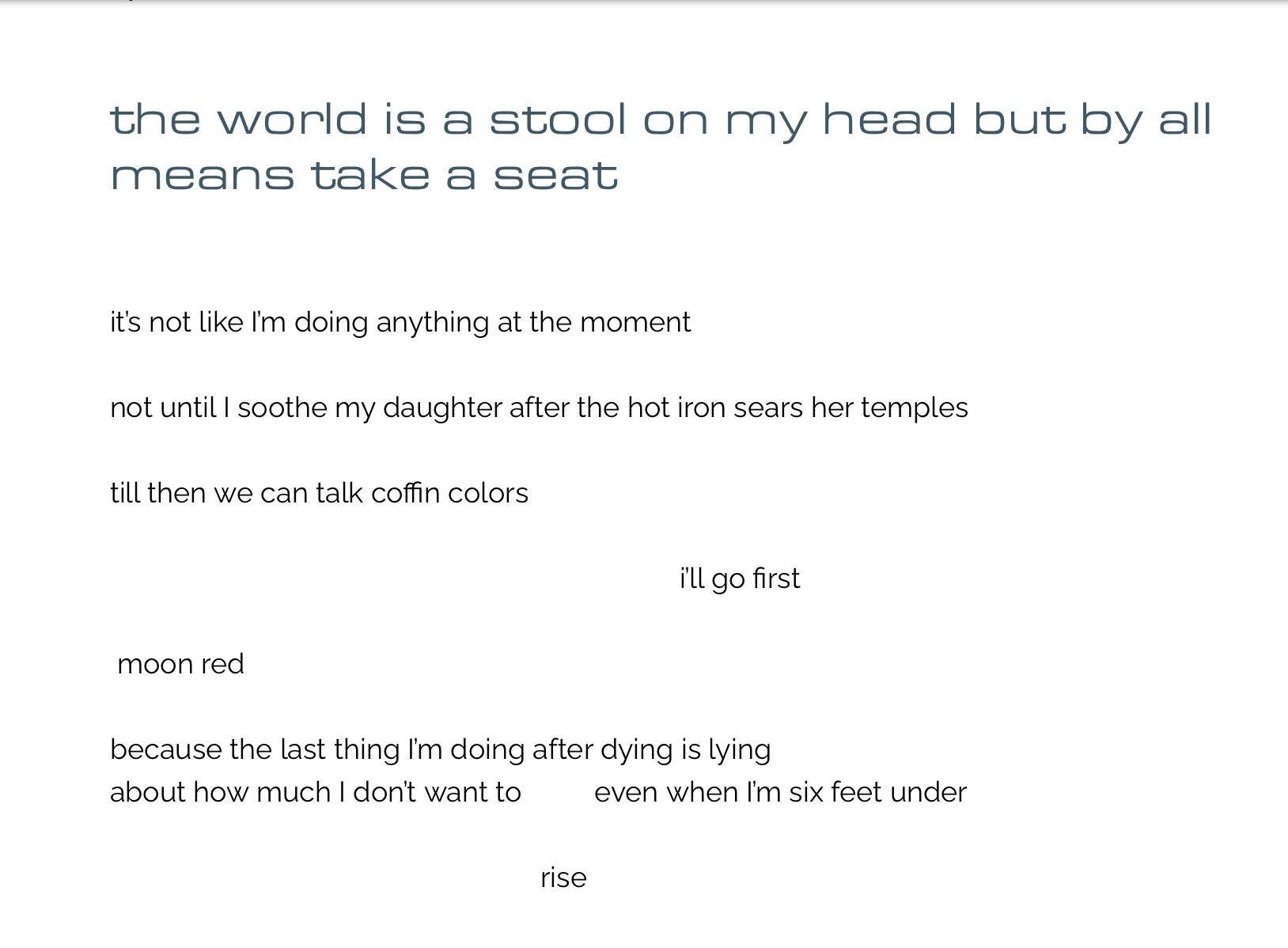 the world is a stool on my head but by all means take a seat Feb 21 Written By Liz Femi Pushcart Prize in Poetry (2024) via Good River Review Liz Femi
